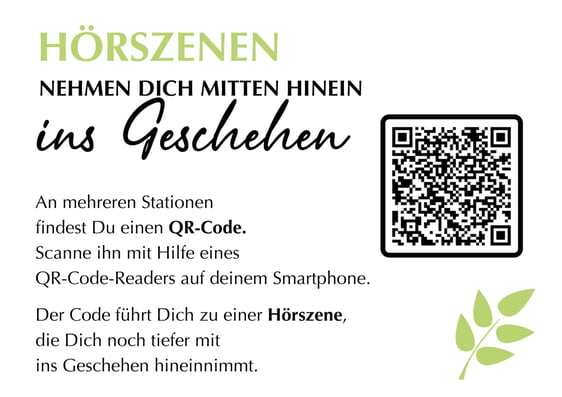 An manchen Stationen kann zusätzlich zu den Infotafeln eine Hörszene abgespielt werden. Sie können diese auf Ihrem Smartphone mithilfe eines QR-Codes starten, den Sie direkt an der Station finden. Nehmen Sie sich dafür gerne Handy-Kopfhörer mit.
