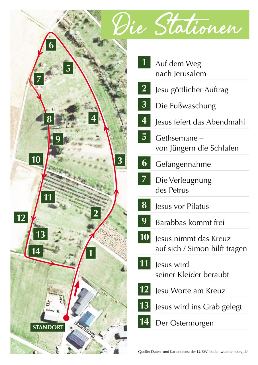 Auf einem ca. 1,5 km langen Rundweg durch Niederhofener Obstwiesen, zeigen kreativ gestaltete Stationen die letzten Tage Jesu bis zu seiner Auferstehung.